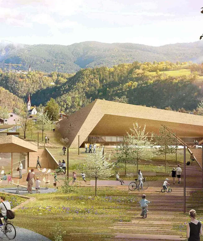 The project stands out for its use of natural and recyclable materials, such as PEFC-certified chestnut wood, which symbolically refers to the trees that adorn the South Tyrolean landscape. The concrete floor, enriched with aggregates sourced from various areas of the region, creates a tangible connection with the territory. The curved shape of the wall, clad in wooden slats, houses interactive niches and historical objects related to culinary tradition.