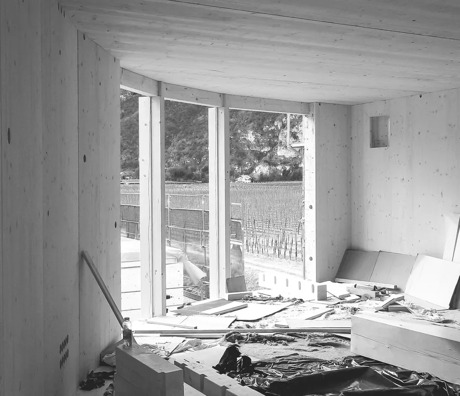 Located in the picturesque countryside of Magrè, the project is designed to maximize solar exposure, with a curved shape extending southward, promoting natural light and heat. This architectural gesture is not only functional but becomes the building's distinctive feature, creating a visual and sensory dialogue with the surrounding landscape, which includes vineyards and the Adige Valley. The structure consists of a main wedge-shaped body, where offices and a showroom are located on the ground floor, with large glass surfaces that ensure optimal brightness and direct contact with the outside environment.