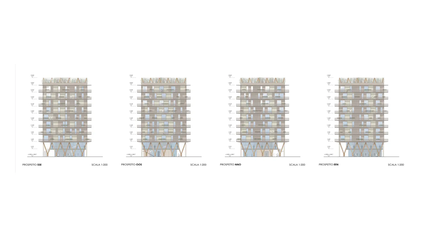 The architecture is characterized by clear forms and strong expressiveness: a two-story arcade, supported by glulam elements, leads to highly visible public spaces. The residential volume extends over eight floors, with regular facades and an innovative checkerboard pattern of prefabricated panels that ensures energy efficiency and comfort. The light balconies and photovoltaic panels at the top not only enhance the aesthetics but also contribute to the sustainability of the building.