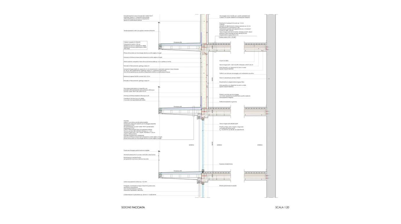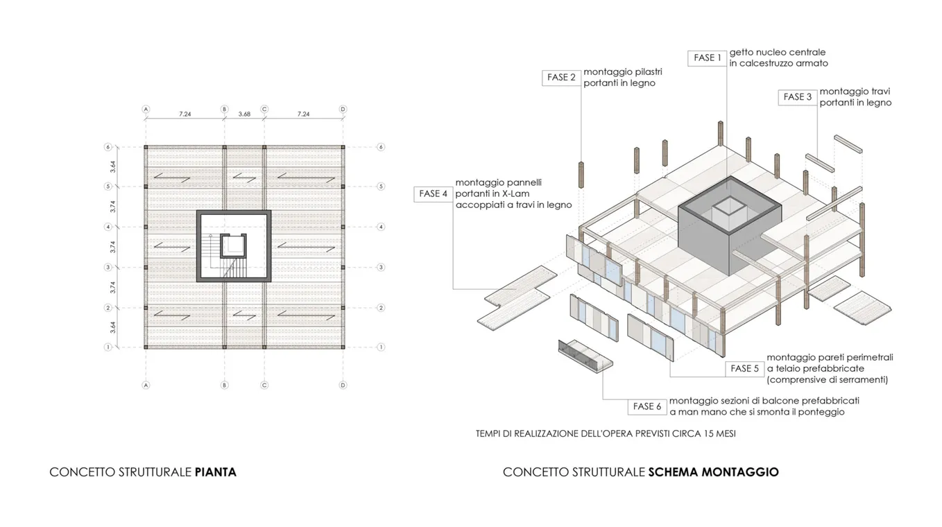 From a technical standpoint, the building uses a prefabricated wooden system, with beams and pillars that offer an open floor plan and flexibility in the interior spaces. A central concrete core ensures safety, while the design choices aim for optimal natural lighting and ventilation for each unit.
